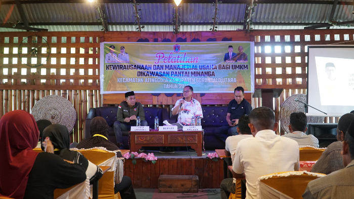 Simpulindo.com, Gorut – Bupati Gorontalo Utara, Thariq Modanggu menjadi narasumber pada Pelatihan Kewirausahaan dan Manajerial Usaha bagi UMKM di kawasan Pantai Minanga, Jumat, (12/12/25). Kegiatan ini diikuti 45 pelaku UMKM dari berbagai sektor usaha di Desa Atinggola dan sekitarnya.