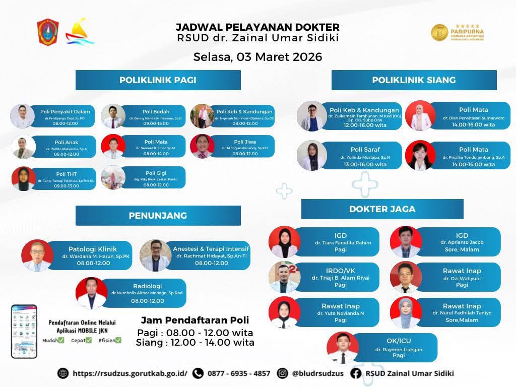 simpulindo.com, Gorut – RSUD dr. Zainal Umar Sidiki resmi merilis jadwal pelayanan dokter untuk Selasa, 3 Maret 2026.