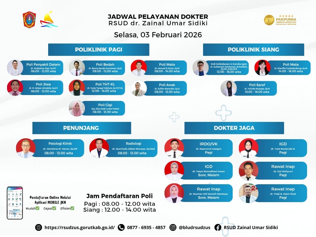 Rumah Sakit Umum Daerah (RSUD) Zainal Umar Sidiki (ZUS) Kabupaten Gorontalo Utara kembali menegaskan komitmennya dalam memberikan pelayanan medis prima dengan merilis jadwal lengkap pelayanan dokter spesialis dan dokter jaga untuk Selasa, 3 Februari 2026.