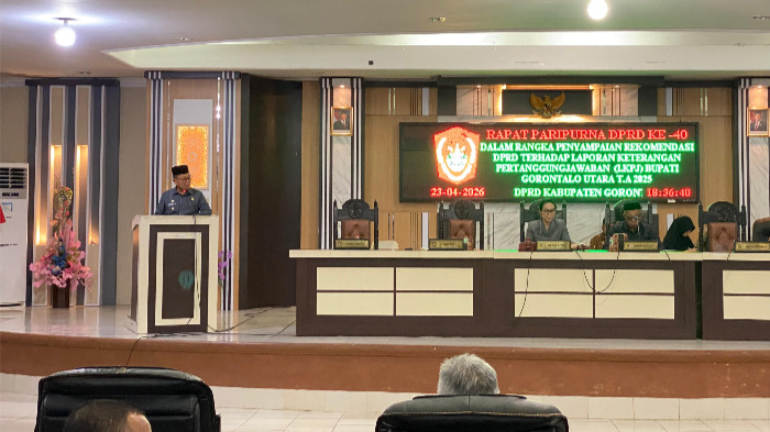 simpulindo.com, Gorut – Bupati Gorontalo Utara menyampaikan sambutan dalam Rapat Paripurna DPRD ke-40, Kamis (23/4/26), dalam rangka penyampaian rekomendasi DPRD terhadap Laporan Keterangan Pertanggungjawaban (LKPJ) Tahun Anggaran 2025.