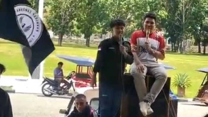 Simpulindo.com, Gorut – Presiden Mahasiswa Universitas Ichsan Gorontalo Utara, Moh. Syahril Koli menyampaikan makian saat berorasi di depan Kantor Bupati Gorontalo Utara dalam aksi yang digelar sejumlah mahasiswa.