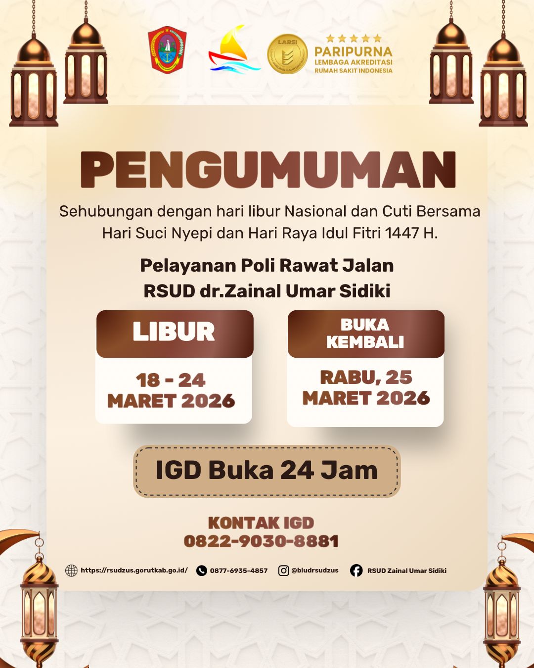 Simpulindo.com, Gorut – Pelayanan kesehatan di RSUD dr. Zainal Umar Sidiki mengalami penyesuaian selama periode libur nasional dan cuti bersama Hari Suci Nyepi serta Hari Raya Idul Fitri 1447 Hijriah.