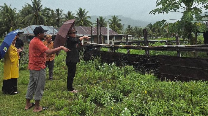 Dalam proses peninjauan, Bupati ditemani camat dan beberapa warga setempat.